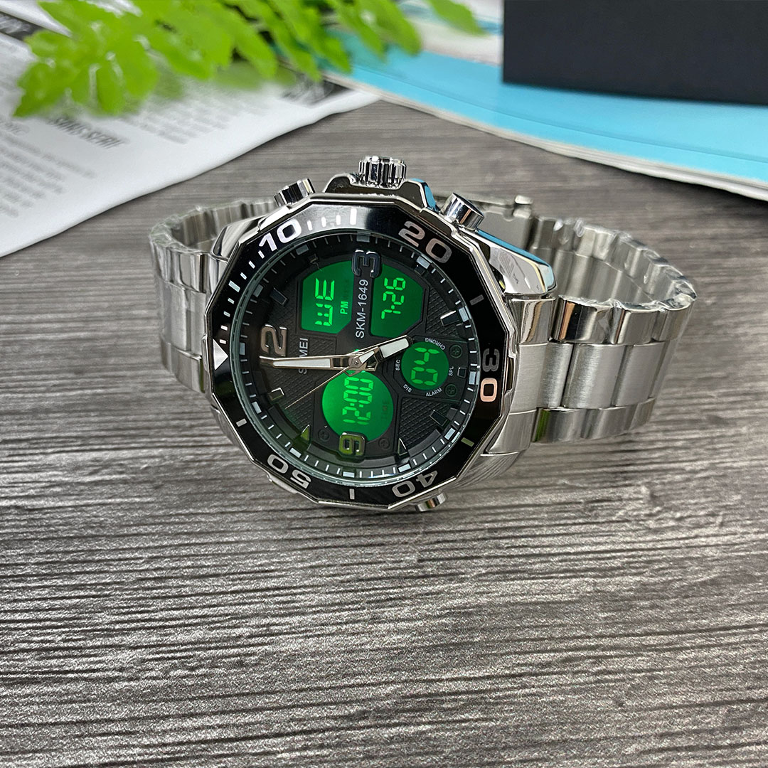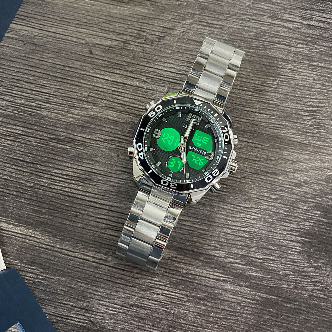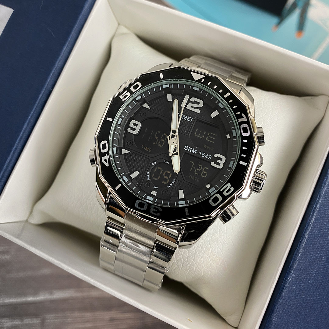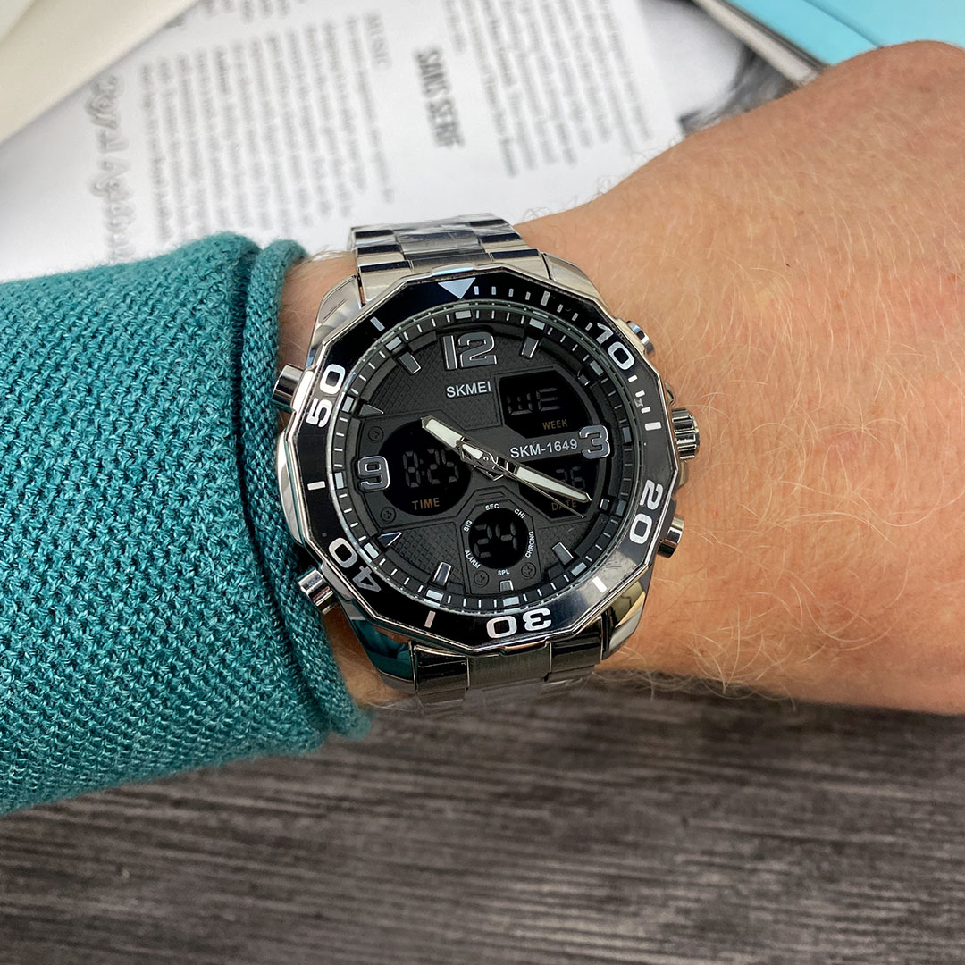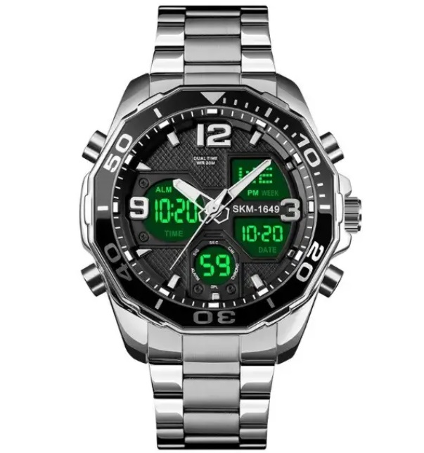 Практичний та функціональний годинник SKMEI — вибір стильних активних людей. У цієї моделі сталевий корпус та браслет, зручна застібка-кліпса. На електронному циферблаті відоражаються: час, дата, день тижня. Присутні функції секундоміра та будильника. На основному аналоговому циферблаті відображаються години, хвилини та секунди. Стрілки, завдяки люмінесцентному покриттю, світяться у темряві, після перебування під освітленням. Яскрава підсвітка вмикається при натисканні кнопки та дає змогу використовувати годинник у сутінках чи повній темряві. Розмір браслета регулюється під будь-яку руку, за допомогою зняття зайвих ланок.
