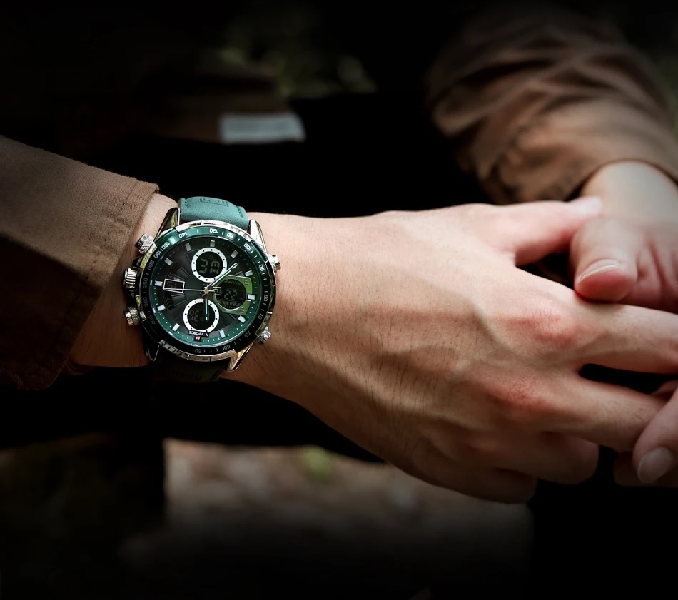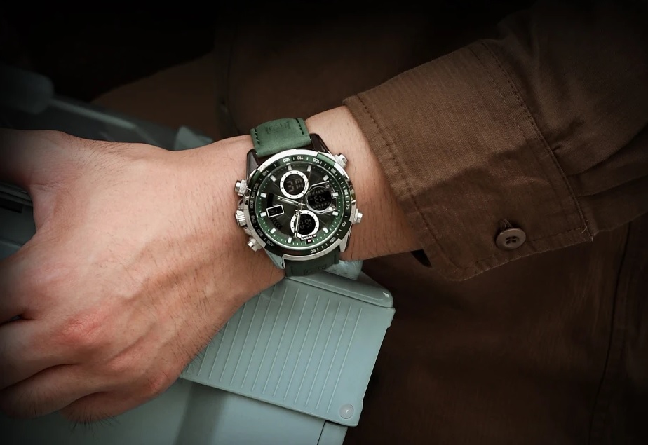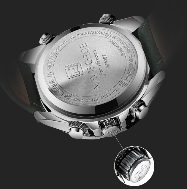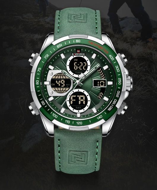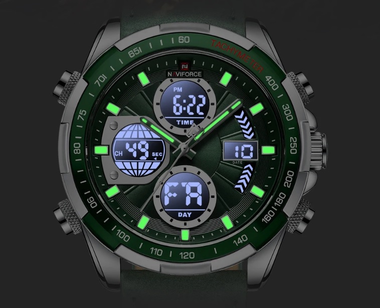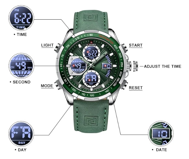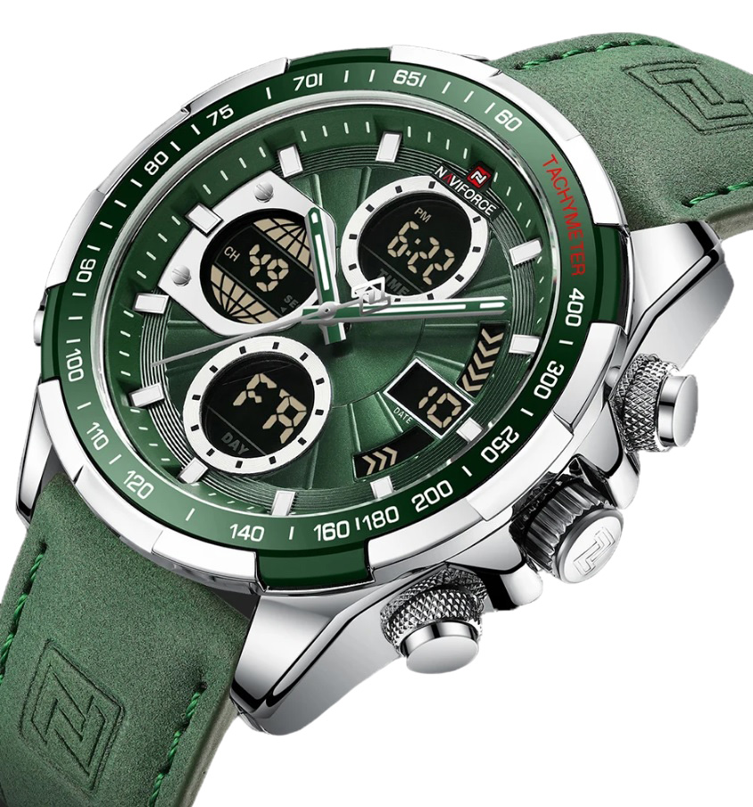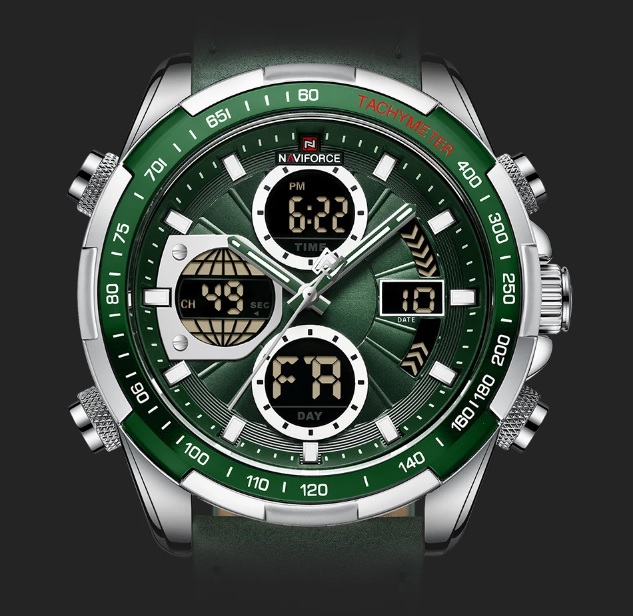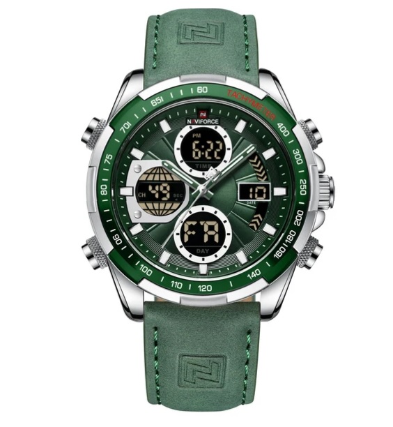 Чоловічий годинник з сучасним дизайном та практичним набором функцій. Годинники бренду Naviforce відрізняються якістю збірки та міцністю. Корпус виготовлений зі сплаву металів, задня кришка з нержавіючої сталі, а циферблат захищає загартоване мінеральне скло Hardlex, розроблене компанією Seiko. Функції: години, хвилини, секунди (відображаються стрілками та на електронному циферблаті), дата, день тижня, підсвітка, будильник, секундомір. Стрілки та поділки на циферблаті світяться у темряві, завдяки люмінесцентному покриттю. Ремінь шкіряний, його розмір регулюється за допомогою отворів; застібка класична. Циферблат та ремінь виконані у темному благородному відтінку зеленого. На цю модель діє гарантія впродовж 12 місяців.