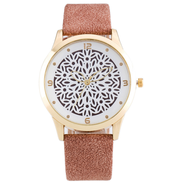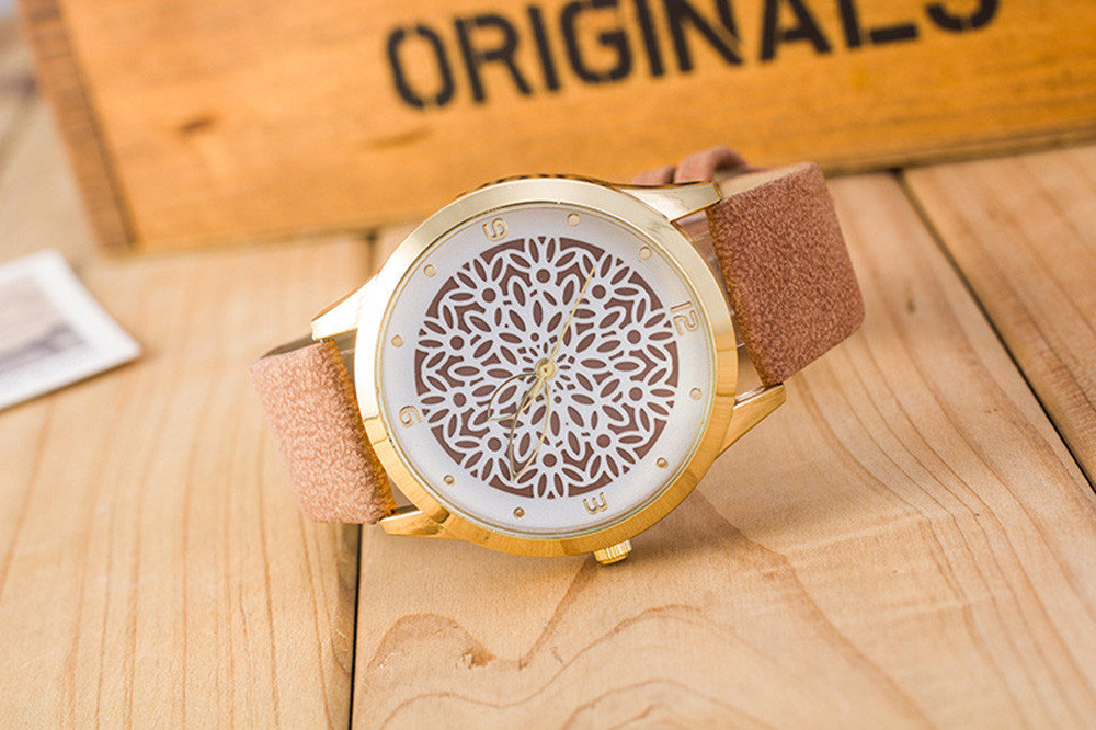 Часы подойдут как на каждый день, так и для особых случаев; аккуратно смотрятся на руке, выглядят женственно. Ремешок часов со слегка выраженной фактурностью, очень мягкий, благодаря чему его удобно застегивать, на ощупь напоминает замшу. Застежка классическая, размер ремешка регулируется с помощью отверстий. Циферблат украшен объемным узорчатым рисунком белого цвета. Корпус часов, стрелки и отметки часов на циферблате имеют цвет желтого золота. Стрелки изящные, необычной формы.