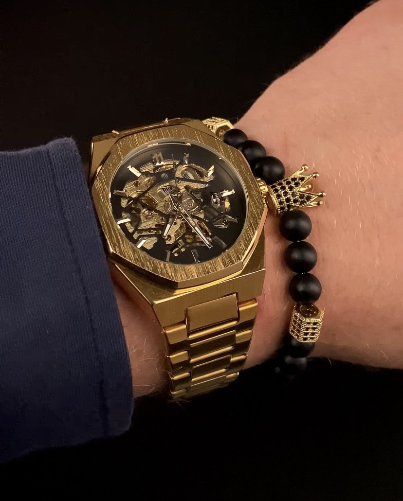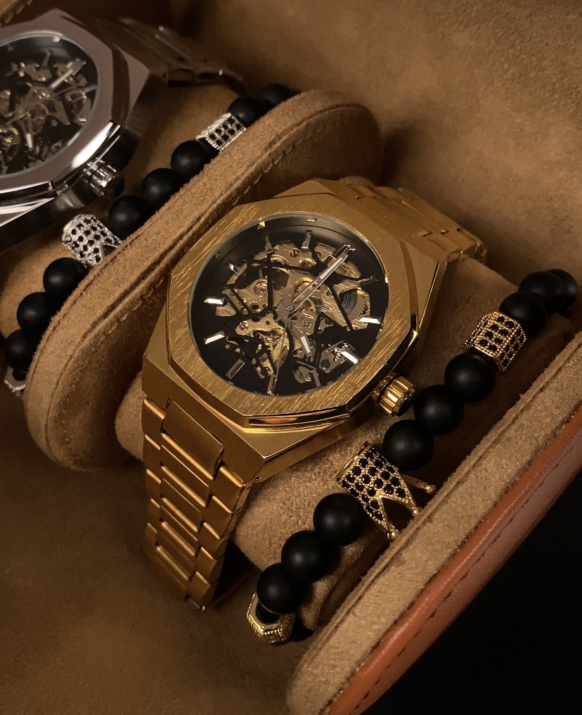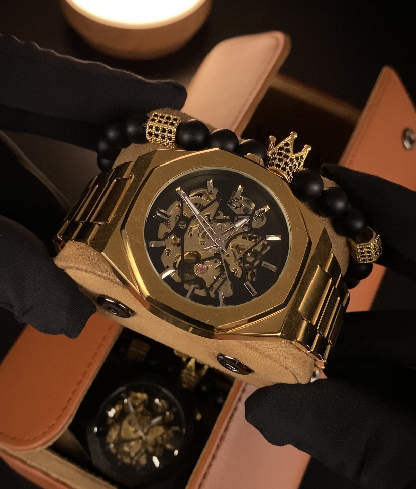 | ОСОБЛИВОСТІ | – СТРІЛКИ СВІТЯТЬСЯ В ТЕМРЯВІ – МОДЕЛЬ СКЕЛЕТОН (ВИДНО МЕХАНІЗМ) – 8-МИ ГРАННИЙ ЦИФЕРБЛАТ |