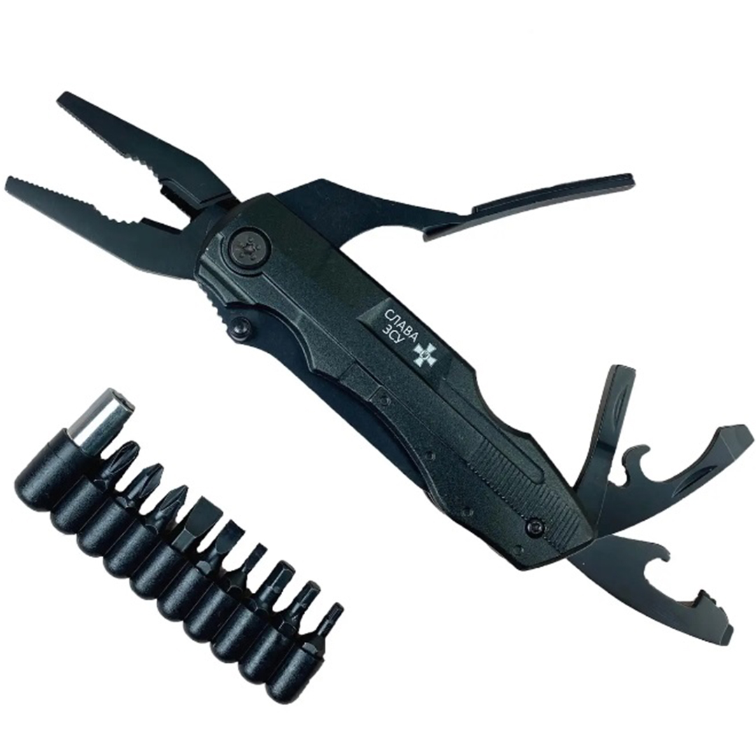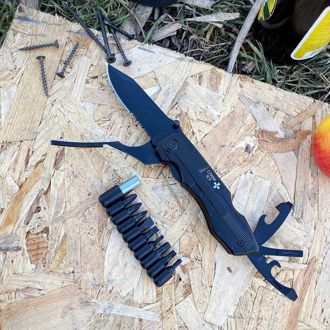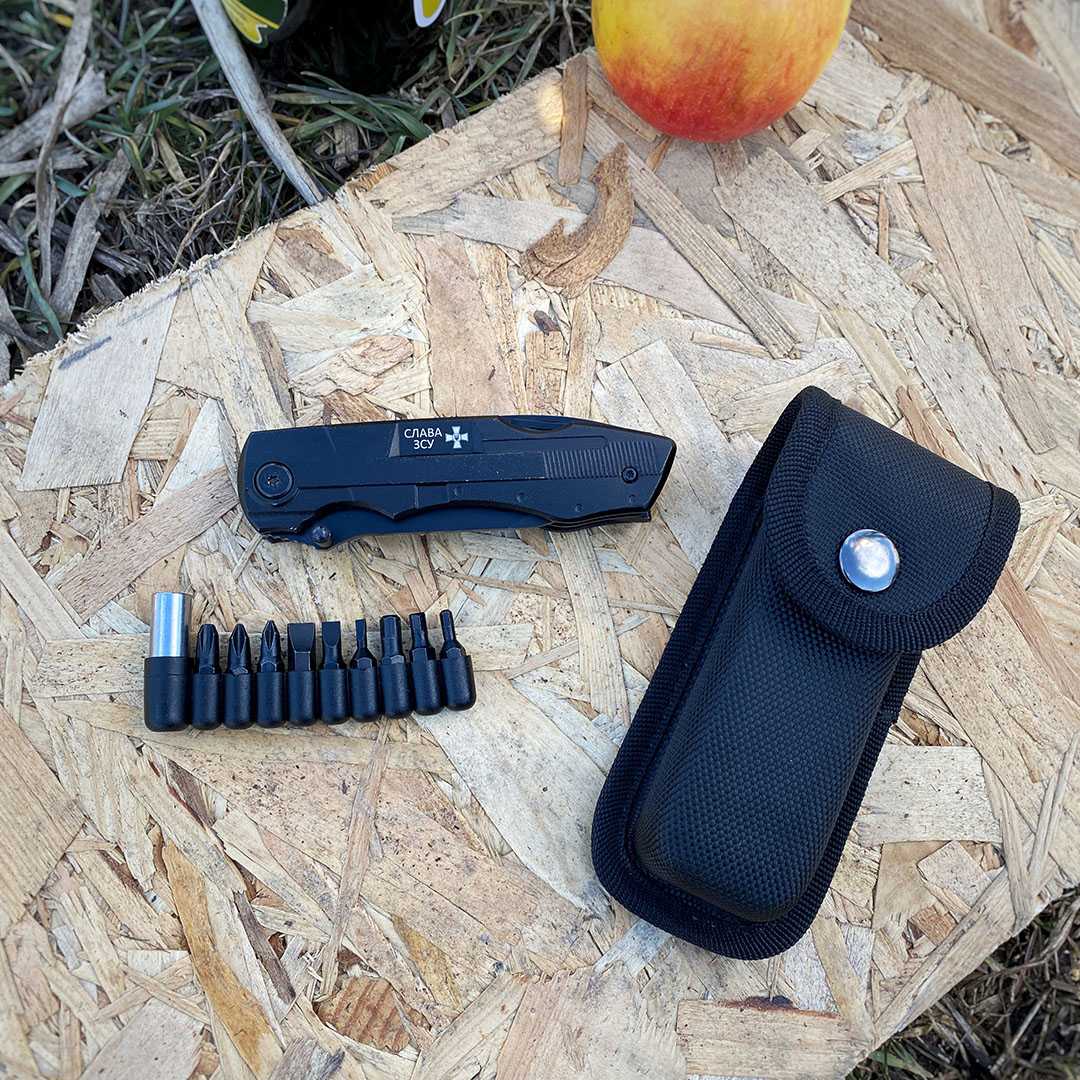 | Інструмент | ніж, відкривачка для пляшок, плоскогубці, шліцева викрутка, відкривачка для консервів, кусачки для дроту, 9 насадок на викрутку |