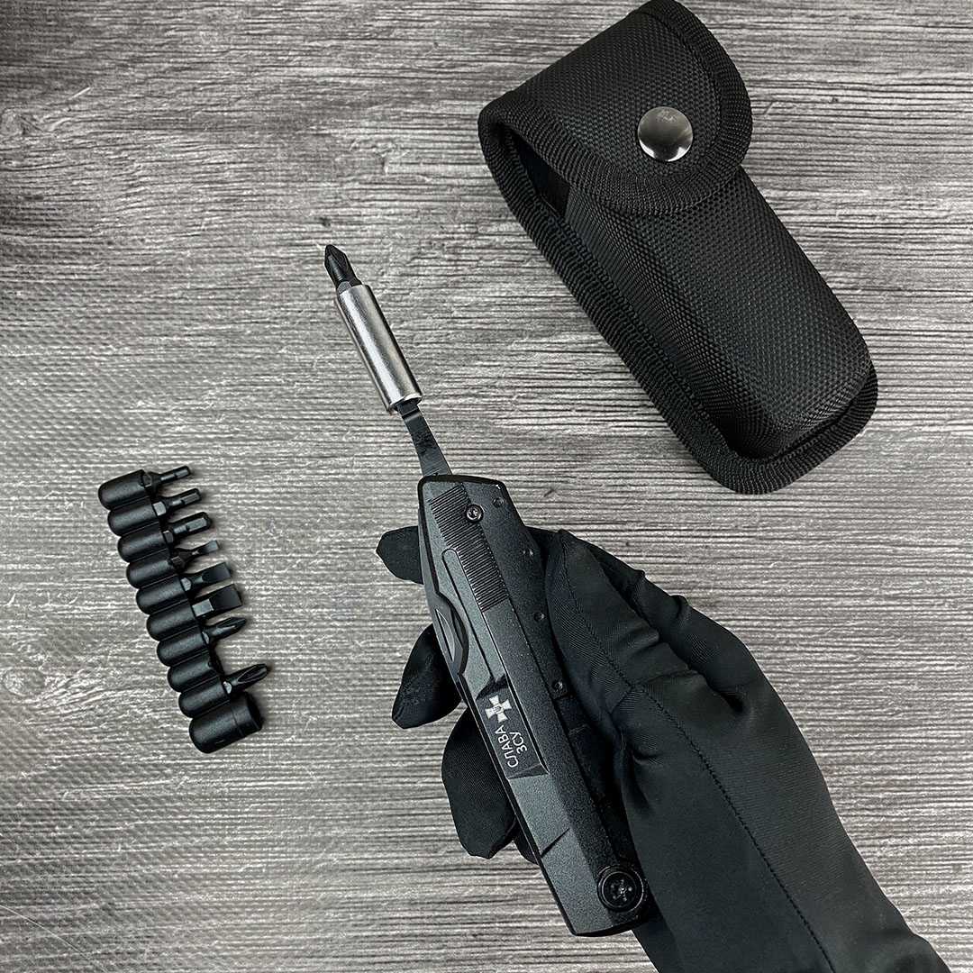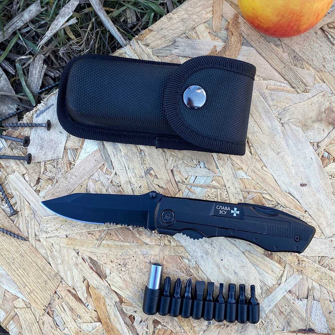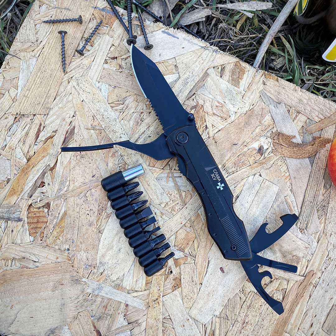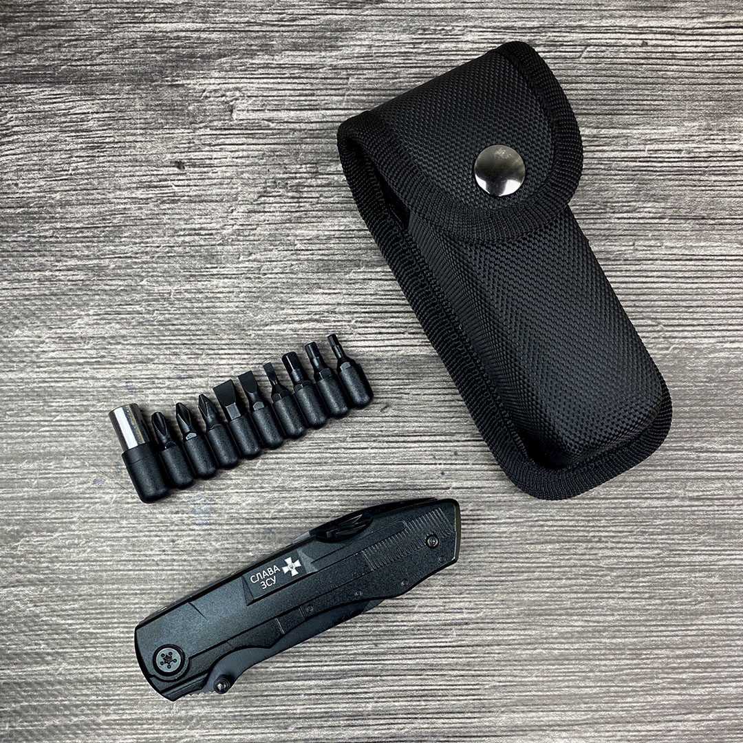 | Інструмент | ніж, відкривачка для пляшок, плоскогубці, шліцева викрутка, відкривачка для консервів, кусачки для дроту, 9 насадок на викрутку |